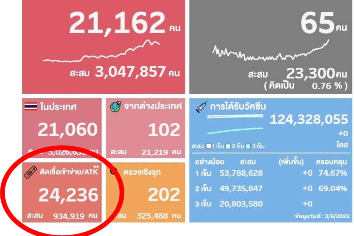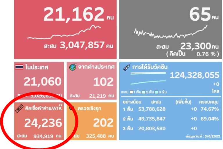 กรมควบคุมโรค กระทรวงสาธารณสุข รายงานข้อมูลผลการตรวจ ATK วันที่ 7 มี.ค.65 เวลา 07.23 น. พบผลการตรวจ ATK เป็นบวกลดลงจากเมื่อวานแต่ยังคงสูงอยู่ และสูงกว่าผลการตรวจผู้ติดเชื้อรายใหม่ที่วันนี้จำนวนผู้ติดเชื้อรายใหม่อยู่ที่ 21,162 ราย จึงทำให้จำนวนผู้ติดเชื้อรายใหม่อยางไม่เป็นทางการอยู่ที่ 45,398 ราย