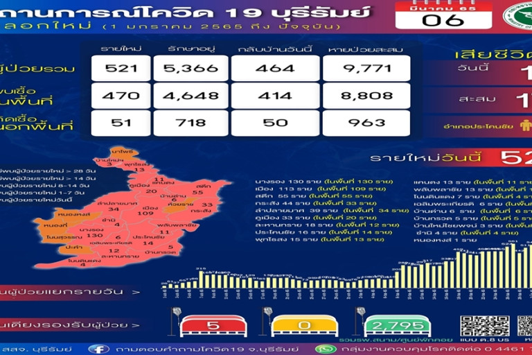 วันที่ 7 มี.ค.65 สำนักงานสาธารณสุขจังหวัดบุรีรัมย์ ได้รายงานข้อมูลสถานการณ์แพร่ระบาดของโรคติดเชื้อไวรัสโควิด-19 ในพื้นที่ จ.บุรีรัมย์ ระลอกใหม่ ตั้งแต่วันที่ 1 ม.ค.65 ถึงวันที่ 6 มี.ค.65 ว่า วันนี้ เพียงวันเดียว พบผู้ป่วยยืนยันติดเชื้อโควิด-19 รายใหม่ จำนวน 521 ราย มีผู้เสียชีวิต 1 ราย ที่ อ.ประโคนชัย เป็นเพศชาย อายุ 59 ปี โดยพบติดเชื้อในพื้นที่จังหวัด 470 ราย และติดเชื้อจากนอกพื้นที่ 51 ราย แยกเป็นติดเชื้อมาจากจังหวัดเสี่ยง 45 ราย และติดเชื้อมาจากจังหวัดเสี่ยง(พบก่อนเข้าสถานกักกันตัว)LQ 6 ราย ซึ่งตัวเลขผู้ป่วยสะสมติดเชื้อโควิด-19 รวมทั้งสิ้น 15,154 ราย มีผู้เสียชีวิตสะสม 17 ราย หายป่วยสะสม 9,771 ราย และยังรักษาอยู่ 5,366 ราย กระจายตามโรงพยาบาลต่างๆ ในพื้นที่จังหวัด