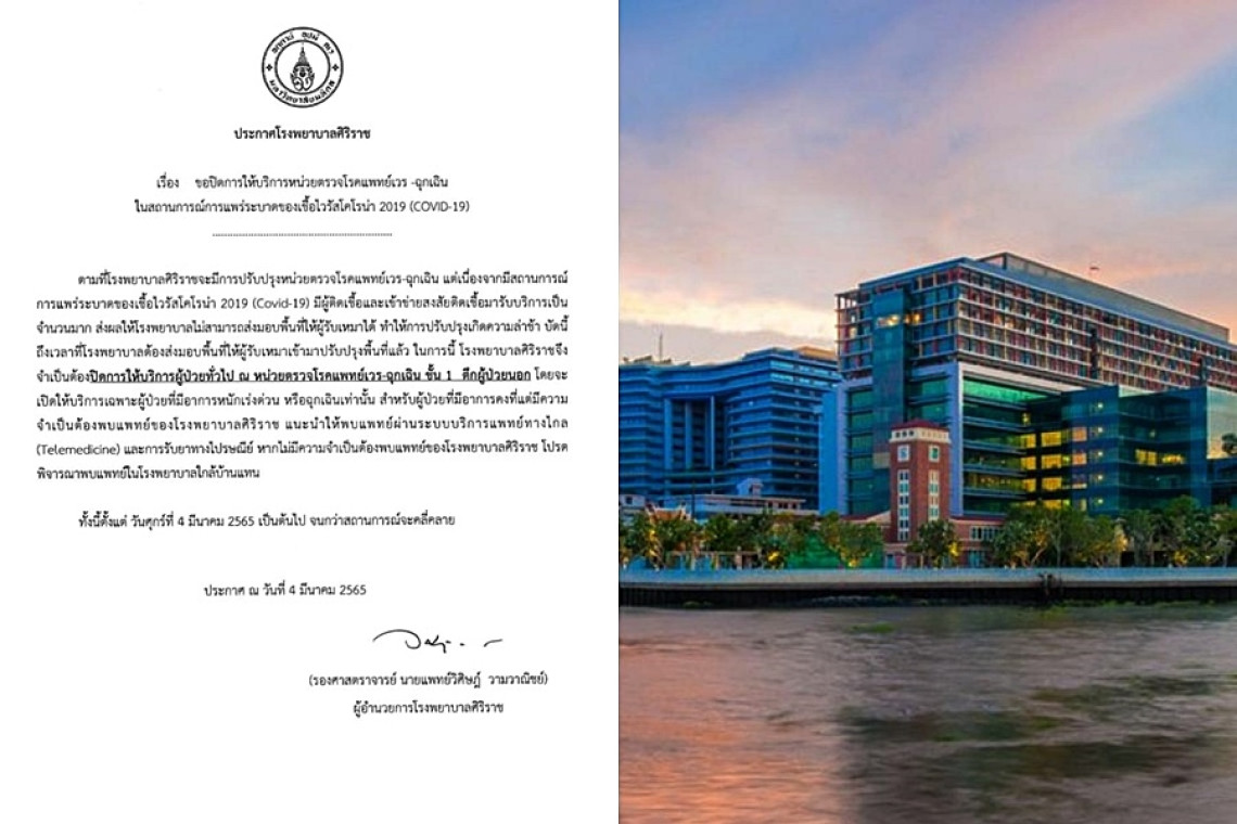 โรงพยาบาลศิริราช ได้ออกประกาศ ขอปิดการให้บริการหน่วยตรวจโรคแพทย์เวร -ฉุกเฉิน ในสถานการณ์การแพร่ระบาดของเชื้อไวรัสโคโรน่า 2019 (COVID-19) โดยระบุ