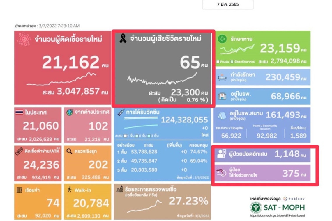 7 มีนาคม 2565 12:20 น. สยามรัฐออนไลน์ คุณภาพชีวิต ชมรมแพทย์ชนบท โพสต์ผ่านเฟซบุ๊กเมื่อวันที่ 7 มี.ค.65 โดยระบุ ยอดตาย -ใส่ท่อหายใจ พุ่งสูงขึ้นต่อเนื่อง ไม่สอดคล้องกับอัตราป่วยที่แสดง แม้รวมยอดทั้ง Pcr /ATK การมุ่งสู่โรคประจำถิ่นยังห่างไกลความเป็นจริง???