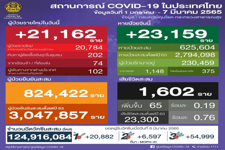 เมื่อวันที่ 7 มี.ค.65 ศูนย์ข้อมูลโควิด-19 รายงานสถานการณ์โรคติดเชื้อไวรัสโควิด-19 โดยข้อมูลล่าสุดไทยพบผู้ติดเชื้อรายใหม่ 21,162 ราย เป็นการติดเชื้อภายในประเทศ 21,060 ราย (เรือนจำ 74 ราย) เดินทางมาจากต่างประเทศ 102 ราย รวมยอดผู้ติดเชื้อสะสมทั้งสิ้น 3,047,857 ราย เสียชีวิตเพิ่มสูงสุดในรอบปี 65 ที่ 65 ราย รวมยอดผู้เสียชีวิตสะสมทั้งสิ้น 23,300 ราย รักษาหายเพิ่มอีก 23,159 ราย รวมยอดรักษาหายสะสม 2,794,048 ราย กำลังรักษาตัว 230,459 ราย โดยอยู่ในโรงพยาบาล 68,966 ราย อยู่ในโรงพยาบาลสนามและอื่นๆ 161,493 ราย พบมีผู้ป่วยปอดอักเสบ 1,148 ราย ในจำนวนนี้ต้องใส่เครื่องช่วยหายใจ 375 ราย โดยกทม.มีผู้ป่วยปอดอักเสบสูงที่สุด 182 ราย