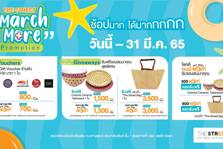 “The Street March More Promotion” ช้อปมาก ได้มาก ประกอบด้วยโปรโมชัน March More ‘Vouchers’ และ March More ‘Giveaways’ โดยมีรายละเอียด ดังนี้