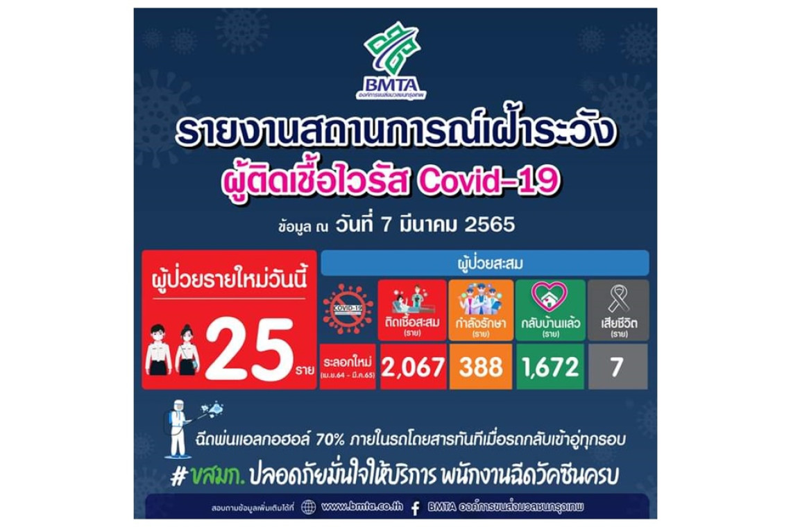 เพจองค์การขนส่งมวลชนกรุงเทพ โพสต์ระบุว่า ประกาศคณะทำงานศูนย์ปฏิบัติการภาวะฉุกเฉินโรคติดเชื้อไวรัสโคโรนา 2019 (COVID - 19) ประจำวันที่ 7 มีนาคม 2565 พบพนักงานติดเชื้อฯ จำนวน 25 ราย ติดเชื้อสะสม 2,067 ราย กำลังรักษา 388 ราย กลับบ้านแล้ว 1,672 ราย เสียชีวิตสะสม 7 ราย
