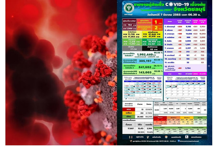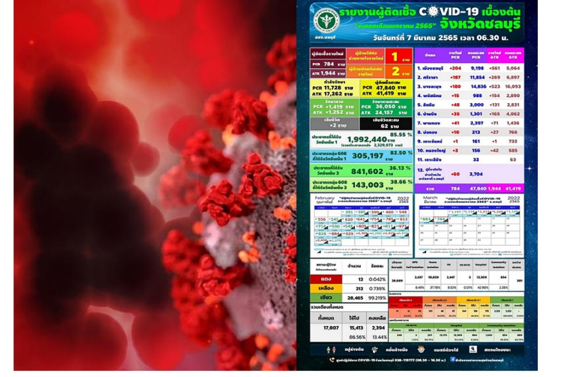 วันที่ 7 มี.ค.65 สสจ.ชลบุรี มีรายงานผู้ติดเชื้อโควิด-19 รายใหม่ จำนวน 784 ราย จาก คนที่พักอาศัยในจังหวัดระยอง เข้ามารักษาในจังหวัดชลบุรี 51 ราย จาก CLUSTER บริษัท ในพื้นที่ อ.เมืองชลบุรี 3 ราย จากอาชีพเสี่ยงพบปะผู้คนจำนวนมาก 33 ราย จากบุคลากรทางการแพทย์ 20 ราย จากผู้ให้ประวัติเดินทางมาจากจังหวัดฉะเชิงเทรา และจังหวัดภูเก็ต รวม 2 ราย