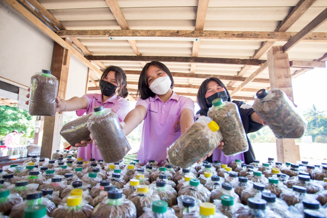 6.ครูแกนนำแบ่งก้อนเชื้อเห็ดนางฟ้าให้นักเรียนทุกคน คนละ 10 ก้อน ประกอบด้วย ก้อนเชื้อเห็ดนางฟ้าจากฟางข้าวและจากขี้เลื่อยยางพารา อย่างละ 5 ก้อน และนักเรียนแต่ละกลุ่มจะได้ก้อนเชื้อเห็ดนางฟ้าทั้งสองประเภท ประเภทละ 50 ก้อน เพื่อนำไปศึกษาการเจริญเติบโตของเส้นใย การเปิดดอกเห็ด การดูแลก้อนเห็ดนางฟ้าขณะออกดอก ทำการเปรียบเทียบการออกดอกของเห็ดนางฟ้าระหว่างก้อนเห็ดจากก้อนเห็ดจากฟางข้าวและจากขี้เลื่อยยางพารา การเก็บ ทำความสะอาด ประกอบอาหาร ศึกษาคุณค่าทางโภชนาการ และการจัดจำหน่ายเห็ดนางฟ้าในชุมชน