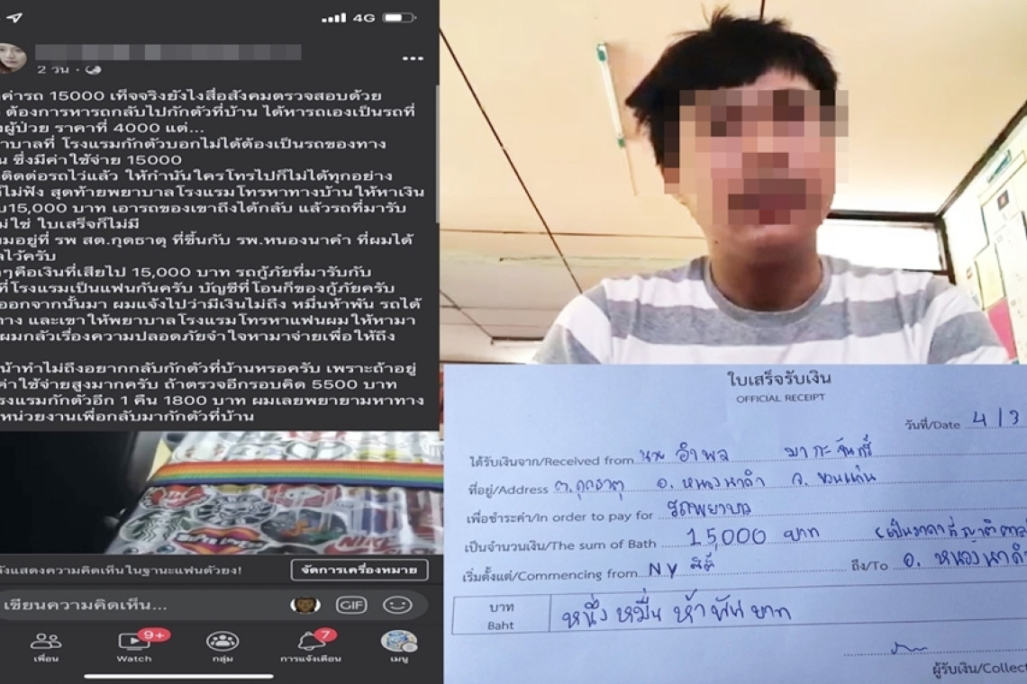 "ในเวลามีรถมูลนิธิ มารับและเป็นคนนำตนเองส่งกลับบ้าน โดยไม่ได้เป็นรถจากโรงพยาบาลแต่อย่างไร และถูกเรียกเก็บค่ารถเป็นเงินจำนวน 15,000 บาท จากนั้นเมื่อมาถึง อ.หนองนาคำ ก็เข้ารับการรักษาและกักตัวที่ รพ.สต.กุดธาตุ ซึ่งตนเองอยากให้มีการตรวจสอบและเรียกร้องขอความเป็นธรรม กับการเรียกเก็บค่ารถพยาบาล 15,000 บาท แต่กลับได้รถมูลนิธิมาส่งแทนรถของโรงพยาบาล"