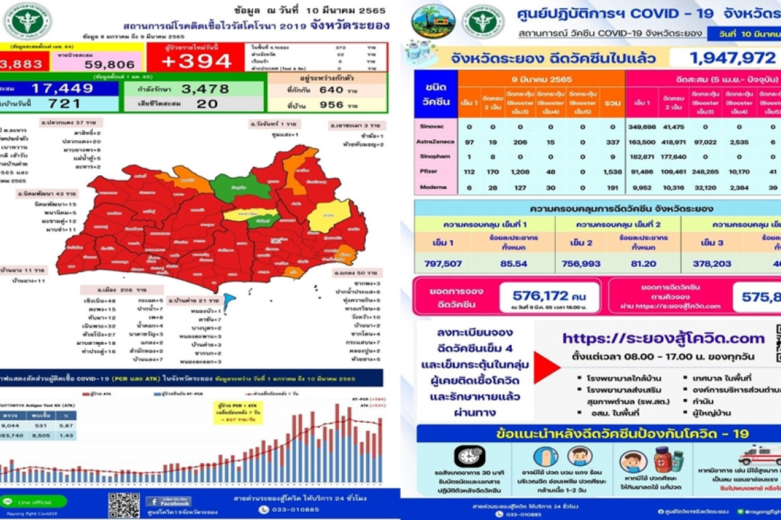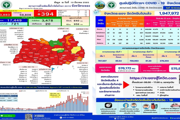 วันที่ 10 มี.ค.65 ศูนย์ปฏิบัติการฯ โควิด-19 ระยอง รายงานสถานการณ์การแพร่ระบาดโควิด-19 ของจังหวัดระยองว่า วันนี้พบผู้ติดเชื้อโควิดเสียชีวิต 1 ราย เป็นเพศหญิง อายุ 81 ปี ชาว ต.ละหาร อ.ปลวกแดง มีโรคประจำตัว ความดันโลหิตสูง เบาหวาน ไขมันในเลือดผิดปกติ เข้ารักษาตัว รพ.บ้านค่าย วันที่ 6 มี.ค.เสียชีวิตวันที่ 8 มี.คส่งผลให้มียอดผู้ติดเชื้อเสียชีวิตสะสมระลอกใหม่เพิ่มเป็น 20 รายแล้ว ส่วนผู้ติดเชื้อรายวันพบเพิ่ม 394 ราย ผู้ติดเชื้อสะสมละลอกใหม่เพิ่มเป็น 63,883 ราย หายป่วยแล้ว 59,806 ราย โดยพบผู้ติดเชื้อทั้ง 8 อำเภอ โดยพบสูงสุดอยู่ใน อ.เมืองระยอง 206 ราย รองลงมามี อ.แกลง 50 ราย อ.นิคมพัฒนา 43 ราย อ.ปลวกแดง 37 ราย อ.บ้านค่าย 21 ราย อ.บ้านฉาง 11 ราย อ.เขาชะเมา 3 ราย อ.วังจันทร์ 1 ราย ต่างจังหวัดเข้ามารักษาตัว 22 ราย ยอดฉีดวัคซีนไปแล้ว 1947,972 เข็ม