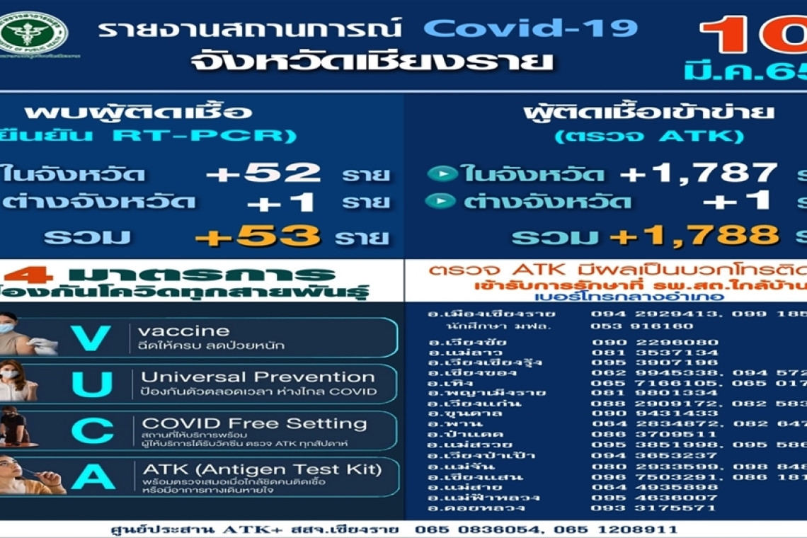 วันที่ 10 มี.ค. 2565 สำนักงานสาธารณสุขจังหวัดเชียงราย ได้รายงานสถานการณ์โรคโควิด 19 จังหวัดเชียงราย พบผู้ติดเชื้อ ตรวจยืนยัน RT-PCR จำนวน 53 ราย ติดเชื้อภายในจังหวัด 52 ราย