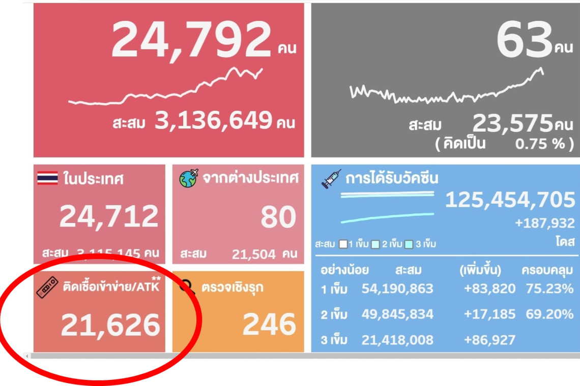 กรมควบคุมโรค กระทรวงสาธารณสุข รายงานข้อมูลผลการตรวจ ATK วันที่ 11 มี.ค.65 เวลา 07.24 น. พบว่าผลการตรวจ ATK เป็นบวกเพิ่มอีก 21,626 ราย ขณะที่จำนวนผู้ติดเชื้อรายใหม่เพิ่มขึ้นที่ 24,792 ราย จึงทำให้ยอดผู้ติดเชื้อรายใหม่อย่างไม่เป็นทางการอยู่ที่ 46,418 ราย