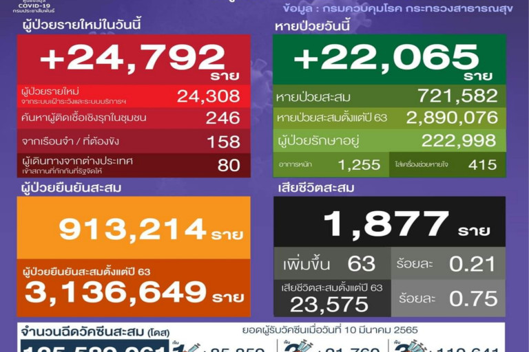 วันที่ 11 มี.ค.2565 ศูนย์ข้อมูลCOVID-19 รายงานสถานการณ์ผู้ป่วยติดเชื้อไวรัสโควิด-19 ว่า โดยล่าสุดพบผู้ติดเชื้อรายใหม่อีก 24,792 ราย โดยเป็นการติดเชื้อในประเทศ 24,712 ราย และเดินทางมาจากต่างประเทศอีก 80 ราย วันนี้มีรายงานลักลอบเข้าประเทศผิดกฎหมาย 3 ราย จากกัมพูชา 2 ราย และเมียนมา 1 ราย ติดเชื้อในประเทศ (แยกเป็นจากระบบเฝ้าระวังและบริการสุขภาพสูงถึง 24,308 ราย จากการตรวจคัดกรองเชิงรุกในชุมชน 246 ราย จากเรือนจำ/ที่ต้องขัง 158 ราย) รวมยอดผู้ป่วยสะสมตั้งแต่ปี 63 รวม 3,136,649 ราย อย่างไรก็ตามหากรวมยอดผู้ป่วยจากการตรวจ ATK จำนวน 21,626 ราย ตัวเลขผู้ป่วยรายใหม่จะมี 46,415 ราย