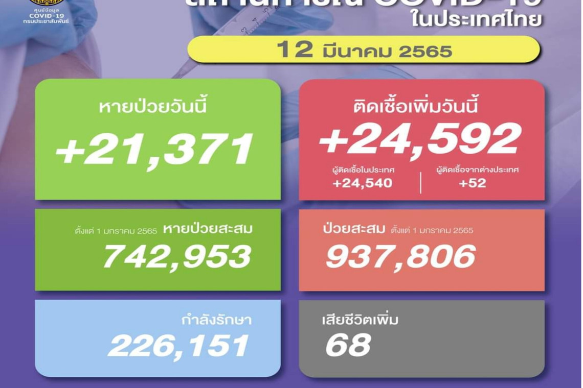 วันที่ 12 มี.ค.2565 ศูนย์ข้อมูล COVID-19 รายงานยอดผู้ติดเชื้อโควิด-19 รายใหม่จำนวน 24,592 ราย จำแนกเป็น ติดเชื้อในประเทศ 24,540 ราย ติดเชื้อจากต่างประเทศ 52 ราย ทำให้ยอดผู้ป่วยสะสมตั้งแต่ 1 มกราคม 2565 มีจำนวน 937,806 ราย หายป่วยกลับบ้าน 21,371 ราย เสียชีวิต 68 ราย รวมเสียชีวิตสะสมตั้งแต่ ปี 2563-ปัจจุบัน จำนวน 23,643 ราย