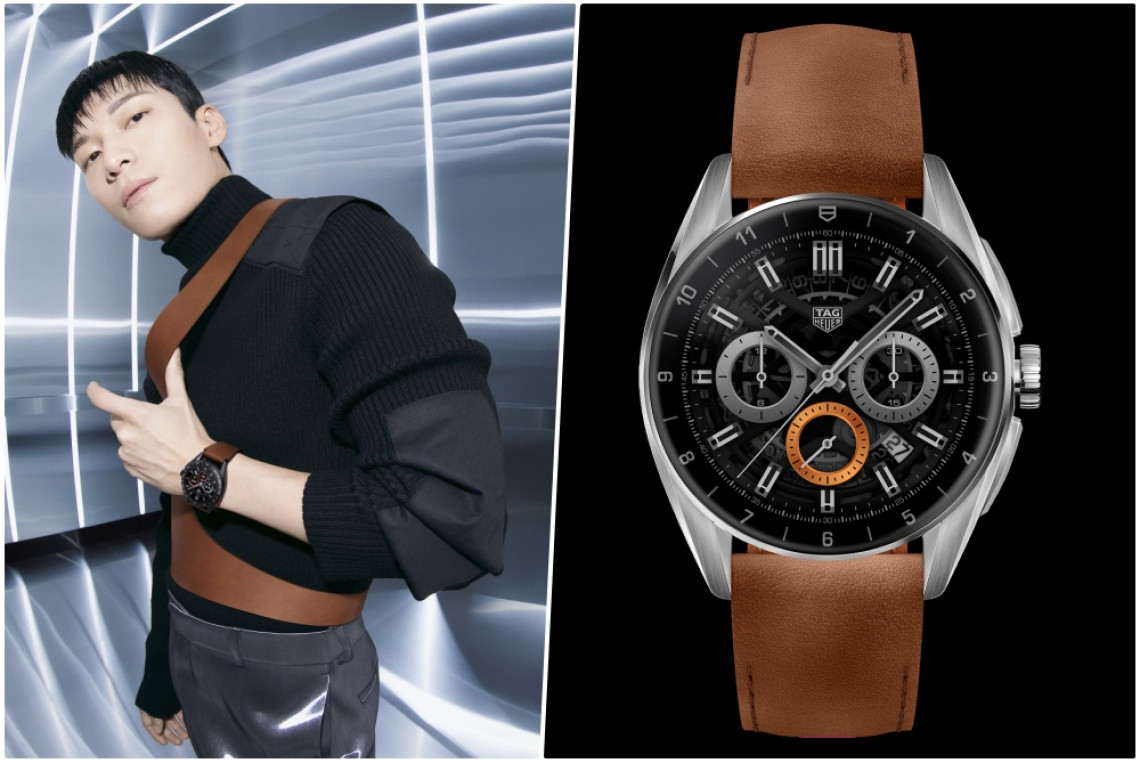 โดยในภาพแคมเปญหนุ่มวีฮาจุนสวมใส่ TAG Heuer Connected Calibre E4 สมาร์ทวอทช์เจเนอเรชั่นใหม่ล่าสุดจาก TAG Heuer