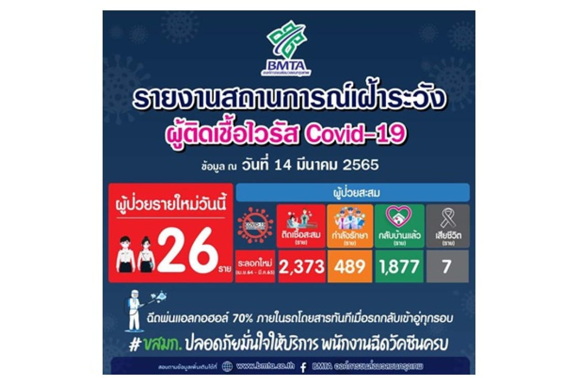 เพจองค์การขนส่งมวลชนกรุงเทพ โพสต์ระบุว่า ประกาศคณะทำงานศูนย์ปฏิบัติการภาวะฉุกเฉินโรคติดเชื้อไวรัสโคโรนา 2019 (COVID - 19) ประจำวันที่ 14 มีนาคม 2565 พบพนักงานติดเชื้อฯ จำนวน 26 ราย ติดเชื้อสะสม 2,373 ราย กำลังรักษา 489 ราย กลับบ้านแล้ว 1,877 ราย เสียชีวิตสะสม 7 ราย