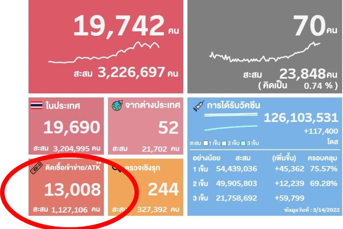 15 มีนาคม 2565 09:52 น. สยามรัฐออนไลน์ คุณภาพชีวิต กรมควบคุมโรค กระทรวงสาธารณสุข รายงานผลการตรวจ ATK วันที่ 15 มี.ค.65 เวลา 07.26 น. พบผลตรวจ ATK เป็นบวกอีก 13,008 ราย ขณะที่จำนวนผู้ติดเชื้อรายใหม่อยู่ที่ 19,742 ราย จึงเท่ากับจำนวนผู้ติดเชื้อรายใหม่อย่างไม่เป็นทางการอยู่ที่ 32,750 ราย