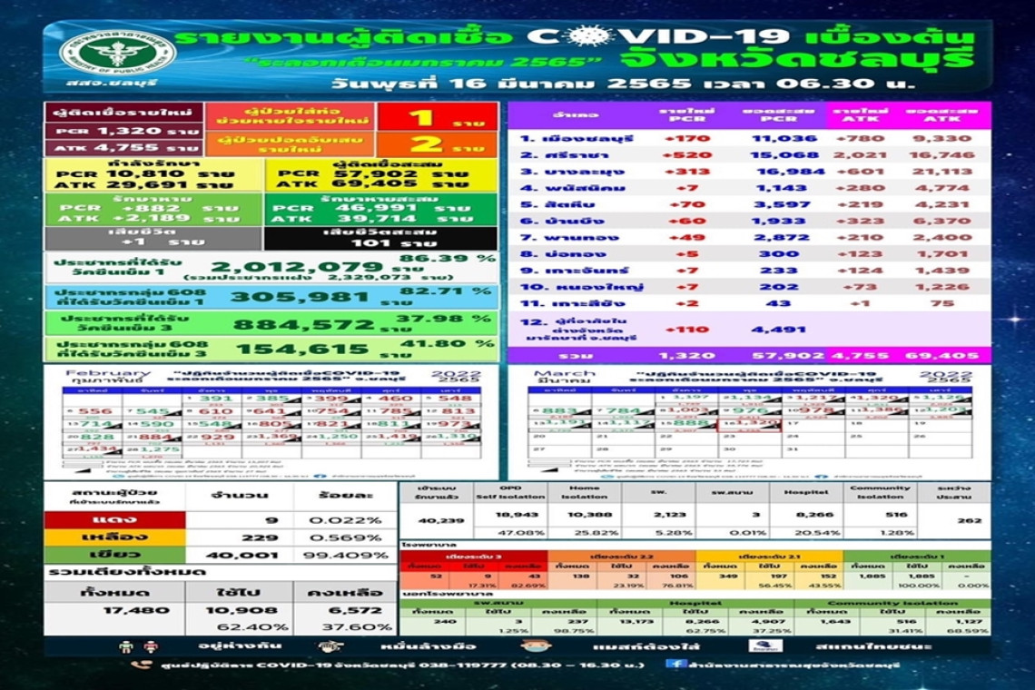 วันที่ 16 มี.ค.65 เวลา 06.30 น. มีรายงานผู้ติดเชื้อโควิด-19 รายใหม่ จำนวน 1,320 ราย (ผู้ติดเชื้อยืนยัน RT-PCR)