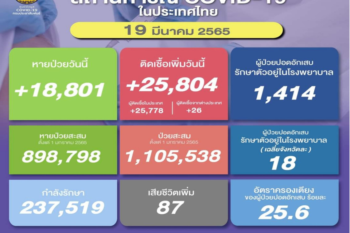 วันที่ 19 มี.ค.2565 ศูนย์ข้อมูล COVID-19 รายงานยอดผู้ติดเชื้อโควิด-19 รายใหม่จำนวน 25,804 ราย จำแนกเป็น ติดเชื้อในประเทศ 25,778 ราย ติดเชื้อจากต่างประเทศ 26 ราย ทำให้ยอดผู้ป่วยสะสมตั้งแต่ 1 มกราคม 2565 มีจำนวน 1,105,538 ราย
