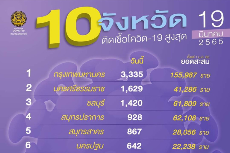 ศูนย์ข้อมูลโควิด-19 รายงานสถานการณ์โรคติดเชื้อไวรัสโควิด-19 ข้อมูล ณ วันที่ 19 มี.ค.65 เวลา 01.00 น. โดยประเทศไทยยังคงพบผู้ติดเชื้อรายใหม่ในทั้ง 77 จังหวัด ซึ่งใน 10 อันดับจังหวัดติดเชื้อสูงสุด มีเพียง 3 จังหวัดที่พบป่วยลดลง แล้วติดอันดับเข้ามาใหม่ 3 จังหวัด ทั้งนี้อันดับ 1 ยังคงเป็นกทม.ตัวเลขเพิ่มขึ้นเล็กน้อยแต่ยังสูงที่สุดที่ 3,335 ราย (จากเมื่อวาน 3,252 ราย) และอันดับ 5 สมุทรสาคร ลดลง 976 ราย (จากเมื่อวาน 1,108 ราย) ขณะที่อันดับ 2 นครศรีธรรมราช ลดลง 1,629 ราย (จาก 1,717 ราย) อันดับ 3 ชลบุรี เพิ่มขึ้น 1,256 ราย (จาก 1,231 ราย) อันดับ 4 สมุทรปราการ ลดลง 928 ราย (จาก 976 ราย) อันดับ 6 นครปฐม 642 ราย (642 ราย) อันดับ 7 ร้อยเอ็ด 623 ราย (เข้ามาใหม่) อันดับ 8 นนทบุรี 586 ราย(เข้ามาใหม่) อันดับ 9 นครราชสีมา 551 ราย (เข้ามาใหม่) อันดับ 10 ราชบุรี 545 ราย (เข้ามาใหม่)