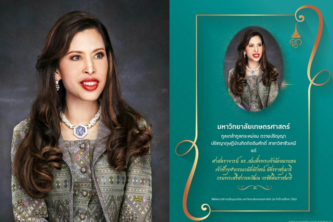 ดร.จงรัก วัชรินทร์รัตน์ อธิการบดีมหาวิทยาลัยเกษตรศาสตร์ กล่าวว่า ตามที่มหาวิทยาลัยเกษตรศาสตร์ ได้รับพระมหากรุณาธิคุณจากพระบาทสมเด็จพระเจ้าอยู่หัว ทรงพระกรุณาโปรดเกล้าฯ ให้ สมเด็จพระเจ้าน้อง นางเธอ เจ้าฟ้าจุฬาภรณวลัยลักษณ์ อัครราชกุมารี กรมพระศรีสวางควัฒน วรขัตติยราชนารี เสด็จแทนพระองค์ พระราชทานปริญญาบัตร ประจำปีการศึกษา 2563 แก่ผู้สำเร็จการศึกษาจากมหาวิทยาลัยเกษตรศาสตร์ ระหว่างวันที่ 21-25 มีนาคม 2565 ณ อาคารจักรพันธ์เพ็ญศิริ ในการนี้ มหาวิทยาลัยเกษตรศาสตร์ จึงขอพระราชทานทูลเกล้าฯ ถวายปริญญาปรัชญาดุษฎีบัณฑิตกิตติมศักดิ์ สาขาวิชาชีวเคมี แด่ ศาสตราจารย์ ดร.สมเด็จพระเจ้าน้องนางเธอ เจ้าฟ้าจุฬาภรณวลัยลักษณ์ อัครราชกุมารี กรมพระศรีสวางควัฒน วรขัตติยราชนารี ในพิธีพระราชทานปริญญาบัตร มหาวิทยาลัยเกษตรศาสตร์ ประจำปีการศึกษา 2563 วันจันทร์ที่ 21 มีนาคม พ.ศ.2565 อีกทั้งได้รับพระราชทานพระอนุญาตให้จัดพิมพ์หนังสือสดุดีเฉลิมพระเกียรติ ศาสตราจารย์
