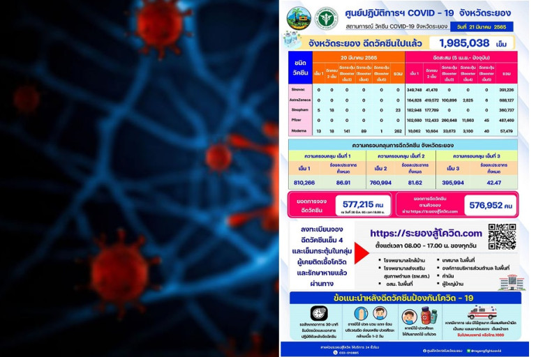 โดยพบสูงสุดอยู่ใน อ.เมืองระยอง 375 ราย รองลงมามี อ.ปลวกแดง 96 ราย อ.นิคมพัฒนา 85 ราย อ.บ้านค่าย 44 ราย อ.บ้านฉาง 41 ราย อ.แกลง 39 ราย อ.เขาชะเมา 12 ราย อ.วังจันทร์ 1 ราย ต่างจังหวัดเข้ามารักษาตัว 45 ราย มีผู้ติดเชื้อเดินทางมาจากต่างประเทศติดเชื้อ 1 ราย มียอดฉีดวัคซีน 1,985,038 เข็ม มียอดจองวัคซีน 577,215 คน