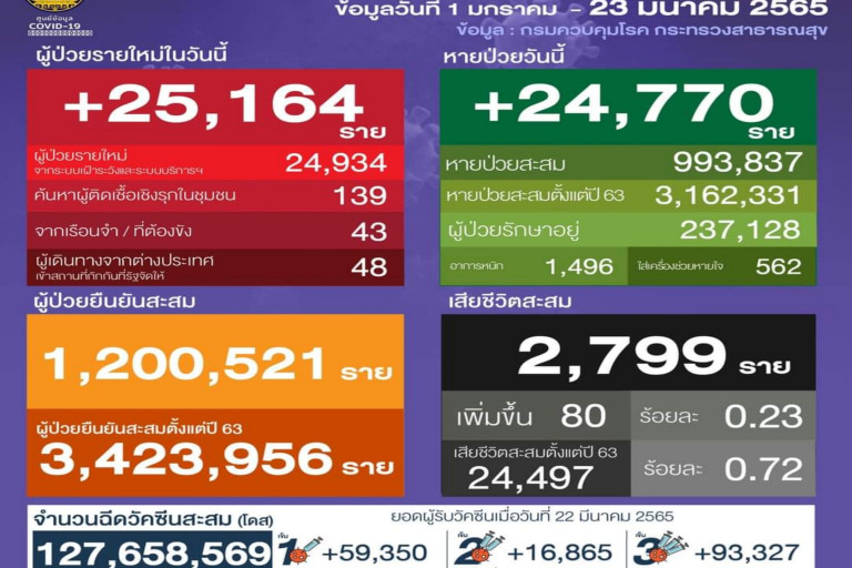 วันที่ 23 มี.ค.2565 ศูนย์ข้อมูลCOVID-19 รายงานสถานการณ์ผู้ป่วยติดเชื้อไวรัสโควิด-19 ว่า โดยล่าสุดพบผู้ติดเชื้อรายใหม่อีก 25,164 ราย โดยเป็นการติดเชื้อในประเทศ 25,116 ราย และเดินทางมาจากต่างประเทศอีก 48 ราย ติดเชื้อในประเทศ (แยกเป็นจากระบบเฝ้าระวังและบริการสุขภาพสูงถึง 24,934 ราย จากการตรวจคัดกรองเชิงรุกในชุมชน 139 ราย จากเรือนจำ/ที่ต้องขัง 43 ราย) รวมยอดผู้ป่วยสะสมตั้งแต่ปี 63 รวม 3,423,956 ราย อย่างไรก็ตามหากรวมยอดผู้ป่วยจากการตรวจ ATK จำนวน 26,812 ราย ตัวเลขผู้ป่วยรายใหม่จะมี 48,194 ราย