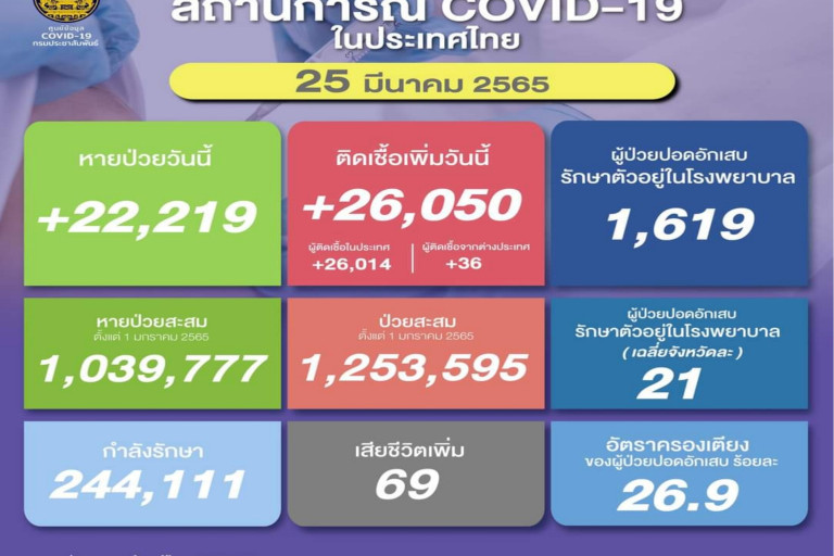 วันที่ 25 มี.ค.2565 ศูนย์ข้อมูล COVID-19 รายงานยอดผู้ติดเชื้อโควิด-19 รายใหม่จำนวน 26,050 ราย จำแนกเป็น ติดเชื้อในประเทศ 26,014 ราย ติดเชื้อจากต่างประเทศ 36 ราย ทำให้ยอดผู้ป่วยสะสมตั้งแต่ 1 มกราคม 2565 มีจำนวน 1,253,595 ราย