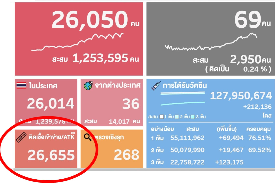 เมื่อวันที่ 25 มี.ค.65 กรมควบคุมโรค กระทรวงสาธารณสุข ได้รายงานข้อมูลผลการตรวจ ATK ข้อมูลเมื่อเวลา 10.26 น. พบผลตรวจ ATK เพิ่มขึ้นอีก 26,655 ราย โดยเพิ่มขึ้นมากกว่าจำนวนผู้ติดเชื้อรายใหม่ในวันนี้ที่อยู่ที่ 26,050 ราย จึงทำให้ยอดผู้ติดเชื้อรายใหม่อย่างไม่เป็นทางการอยู่ที่ 52,705 ราย