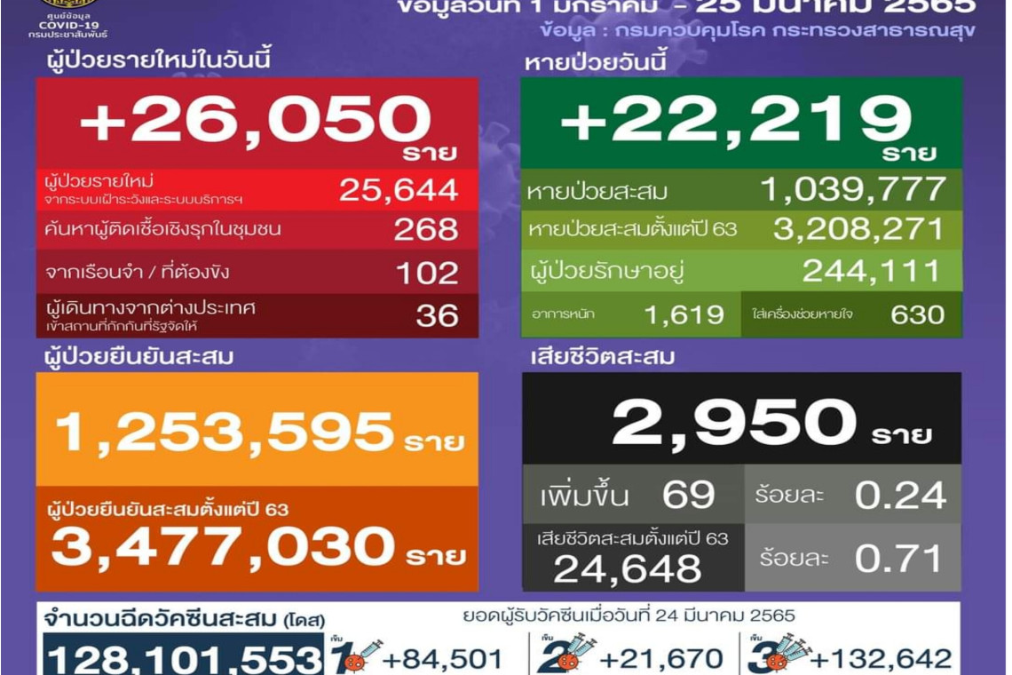 วันที่ 25 มี.ค.2565 ศูนย์ข้อมูลCOVID-19 รายงานสถานการณ์ผู้ป่วยติดเชื้อไวรัสโควิด-19 ว่า โดยล่าสุดพบผู้ติดเชื้อรายใหม่อีก 26,050 ราย โดยเป็นการติดเชื้อในประเทศ 26,014 ราย และเดินทางมาจากต่างประเทศอีก 36 ราย วันนี้มีรายงานลักลอบเข้าประเทศผิดกฎหมาย 14 ราย จากเมียนมา ติดเชื้อในประเทศ (แยกเป็นจากระบบเฝ้าระวังและบริการสุขภาพสูงถึง 25,644 ราย จากการตรวจคัดกรองเชิงรุกในชุมชน 268 ราย จากเรือนจำ/ที่ต้องขัง 102 ราย) รวมยอดผู้ป่วยสะสมตั้งแต่ปี 63 รวม 3,477,030 ราย อย่างไรก็ตามหากรวมยอดผู้ป่วยจากการตรวจ ATK จำนวน 26,655 ราย ตัวเลขผู้ป่วยรายใหม่จะมี 52,707 ราย
