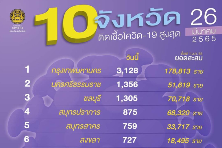 ศูนย์ข้อมูลโควิด-19 รายงานสถานการณ์โรคติดเชื้อไวรัสโควิด-19 ข้อมูล ณ วันที่ 26 มี.ค.65 เวลา 01.00 น. พบว่าประเทศไทยยังคงพบผู้ติดเชื้อรายใหม่ในทั้ง 77 จังหวัด โดยพบใน 10 อันดับจังหวัดติดเชื้อสูงสุด โดยส่วนใหญ่มียอดลดลง ยกเว้น 3 จังหวัด ที่มีตัวเลขติดเชื้อเพิ่มขึ้น คือ อันดับ 3 ชลบุรี พบรายใหม่อยู่ที่ 1,305 ราย (จากเมื่อวาน 1,090 ราย) อันดับที่ 8 ร้อยเอ็ด 657 ราย (จากเมื่อวาน 655 ราย) และอันดับที่ 9 นนทบุรี 652 ราย (จากเมื่อวาน 647 ราย) ทั้งนี้กทม.แม้วันนี้ตัวเลขจะลดลงแต่ก๋ยังครองอันดับ 1 ผู้ติดเชื้อรายใหม่สูงสุดและมียอดผู้ป่วยสะสมมากที่สุด โดยรายใหม่อยู่ที่ 3,128 ราย (จากเมื่อวาน 3,739 ราย) อันดับ 2 นครศรีธรรมราช 1,356 ราย(จากเมื่อวาน 1,645 ราย) อันดับ 4 สมุทรปราการ 875 ราย(จากเมื่อวาน 902) อันดับที่ 5 สมุทรสาคร 759 ราย (จากเมื่อวาน 831 ราย) อย่างไรก็ตามวันนี้พบจังหวัดติด 1-10 เข้ามาใหม่ คือ อันดับ 6 สงขลา 727 ราย อันดับ 7 นครปฐม 691 ราย และอันดับ 10 พัทลุง 581 ราย