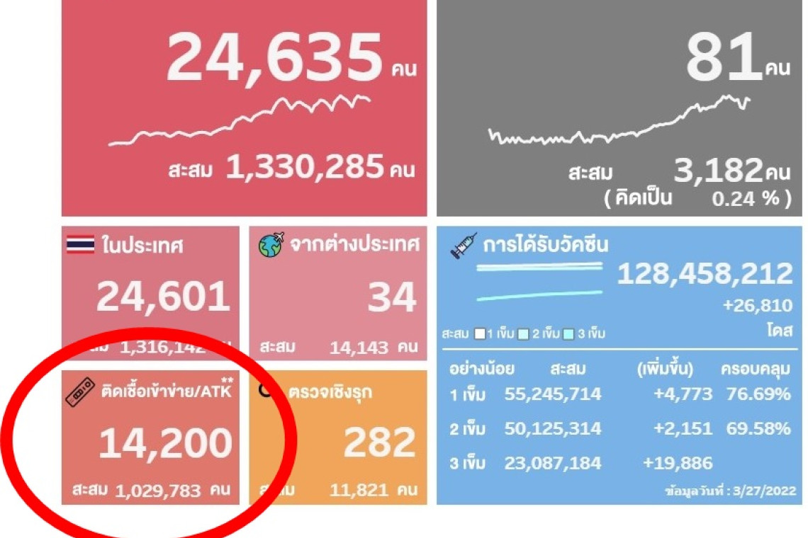 28 มีนาคม 2565 08:43 น. สยามรัฐออนไลน์ คุณภาพชีวิต เมื่อวันที่ 28 มี.ค.65 กรมควบคุมโรค กระทรวงสาธารณสุข รายงานข้อมูลผลการตรวจ ATK เวลา 07.31 น. พบผลตรวจ ATK เป็นบวก 14,200 ราย ขณะที่จำนวนผู้ติดเชื้อรายใหม่อยู่ที่ 24,635 ราย จึงทำให้ยอดผู้ติดเชื้อรายใหม่อย่างไม่เป็นทางการอยู่ที่ 38,835 ราย