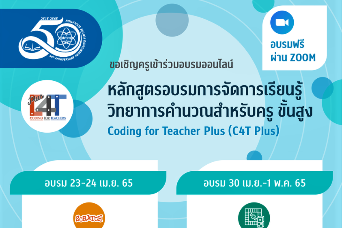 สถาบันส่งเสริมการสอนวิทยาศาสตร์และเทคโนโลยี (สสวท.) อบรมครูออนไลน์ฟรี ปิดเทอมนี้เพิ่มทักษะความรู้กับหลักสูตรการจัดการเรียนรู้วิทยาการคำนวณสำหรับครู ขั้นสูง (Coding for Teacher Plus : C4T Plus) 4 หลักสูตรเลือกเลย หลักสูตรการเขียนโปรแกรม Scratch (C4T Plus-Scratch) อบรมวันที่ 23-24 เมษายน 2565 และ หลักสูตรวิทยาการข้อมูล ระดับมัธยมศึกษา (C4T Plus-Data Science) อบรมวันที่ 23-24 เมษายน 2565 สนใจสมัครได้ตั้งแต่บัดนี้ถึง 17 เมษายน 2565 ประกาศผลการคัดเลือกทางอีเมลและเพจสาขาคอมพิวเตอร์ สสวท. https://www.facebook.com/oho.ipst วันที่ 18 เมษายน 2565 สมัครที่ https://bit.ly/C4T-APR22-1