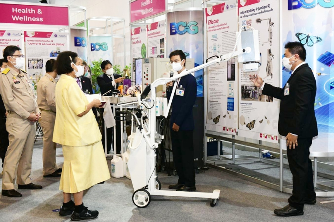 และเครื่อง BodiiRay P (บอดีเรย์ พี) เครื่องเอกซเรย์ดิจิทัลสองมิติ (Portable Digital Radiography) ที่วิจัยและพัฒนาโดยทีมวิจัยระบบสร้างภาพทางการแพทย์ ศูนย์วิจัยเทคโนโลยีสิ่งอำนวยความสะดวกและเครื่องมือแพทย์ สวทช. ใช้สำหรับเอกซเรย์อวัยวะภายในแบบสองมิติ เครื่องมีขนาดเล็กและสะดวกในการเคลื่อนย้ายไปใช้งานในที่ต่างๆ ประกอบด้วยเครื่องกำเนิดเอกซเรย์ ฉากรับรังสีดิจิทัลแบบไร้สาย คอมพิวเตอร์แบบพกพา ซอฟต์แวร์บริหารจัดการข้อมูลผู้ป่วยและจัดเก็บภาพถ่ายเอกชเรย์ ตั้งค่าและควบคุมการถ่ายเอกชเรย์ ประมวลผลภาพ และแสดงภาพเอกซเรย์แบบดิจิทัล (RadiView Software) โดยสามารถเชื่อมต่อกับระบบจัดเก็บสื่อสารข้อมูลภาพทางการแพทย์ (PACS) ได้กลุ่มพลังงาน วัสดุและเคมีชีวภาพ ได้แก่ ผลิตภัณฑ์ถุงมือยางธรรมชาติโปรตีนต่ำ ซึ่งนักวิจัยเอ็มเทค สวทช. ลดปริมาณโปรตีนที่ก่อให้เกิดภูมิแพ้ในผลิตภัณฑ์ถุงมือยางธรรมชาติให้มีปริมาณโปรตีนที่ก่อให้เกิดภูมิแพ้น้อยเป็นไปตามเกณฑ์มาตรฐาน ช่วยยกระดับคุณภาพของผลิตภัณฑ์ถุงมือยางธรรมชาติให้สามารถแข่งขันได้กับผลิตภัณฑ์ถุงมือยางสังเคราะห์