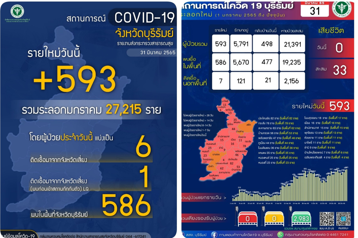 วันนี้ (1 เม.ย.65) สำนักงานสาธารณสุขจังหวัดบุรีรัมย์ ได้รายงานข้อมูลสถานการณ์แพร่ระบาดของโรคติดเชื้อไวรัสโควิด-19 ในพื้นที่ จ.บุรีรัมย์ ระลอกใหม่ ตั้งแต่วันที่ 1 ม.ค.65 ถึงวันที่ 31 มี.ค.65 ว่า วันนี้ เพียงวันเดียว พบผู้ป่วยยืนยันติดเชื้อโควิด-19 รายใหม่ จำนวน 593 ราย ไม่มีผู้เสียชีวิต โดยพบติดเชื้อในพื้นที่จังหวัด 586 ราย และติดเชื้อจากนอกพื้นที่ 7 ราย แยกเป็นติดเชื้อมาจากจังหวัดเสี่ยง 6 ราย และติดเชื้อมาจากจังหวัดเสี่ยง(พบก่อนเข้าสถานกักกันตัว)LQ 1 ราย รวมยอดผู้ป่วยสะสมติดเชื้อโควิด-19 ระลอกมกราคม 27,215 ราย มีผู้เสียชีวิตสะสม 33 ราย หายป่วยสะสม 21,391 ราย และยังรักษาอยู่ 5,791 ราย กระจายตามโรงพยาบาลต่างๆ ในพื้นที่จังหวัด