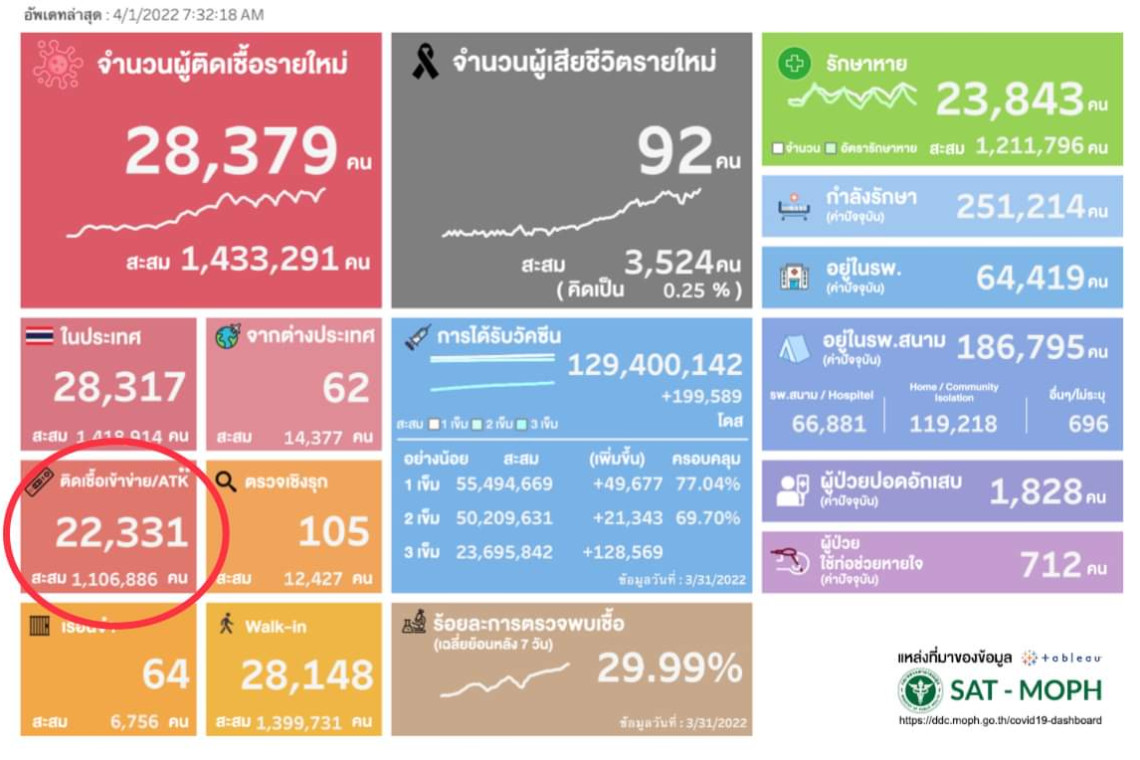 ข้อมูลกรมควบคุมโรค กระทรวงสาธารณสุข รายงานวันที่ 1 เม.ย.65 พบผู้ติดเชื้อรายใหม่ 28,379 ราย โดยพบผลตรวจ ATK เพิ่มอีก 22,331 ราย รวมผลตรวจ ATK สะสมจำนวน 1,106,886 ราย โดยเมื่อรวมผลตรวจ ATK และจะทำให้จำนวนผู้ติดเชื้อรายใหม่อยู่ที่ 50,710 ราย ผู้เสียชีวิต 92 ราย