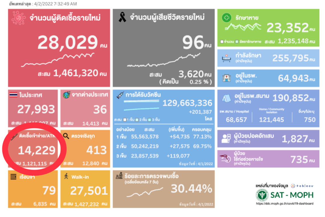 ข้อมูลกรมควบคุมโรค กระทรวงสาธารณสุข รายงานวันที่ 2 เม.ย.65 พบผู้ติดเชื้อรายใหม่ 28,029 ราย โดยพบผลตรวจ ATK เพิ่มอีก 14,229 ราย (ลดลงจากเมื่อวาน 22,331)รวมผลตรวจ ATK สะสมจำนวน 1,121,115 ราย โดยเมื่อรวมผลตรวจ ATK และจะทำให้จำนวนผู้ติดเชื้อรายใหม่อยู่ที่ 42,258 ราย ซึ่งเป็นตัวเลขที่ยังสูงต่อเนื่อง ส่วนผู้เสียชีวิตวันนี้ทำลายสถิติอีกครั้ง 96 ราย(จากเมื่อวาน 92 ราย)
