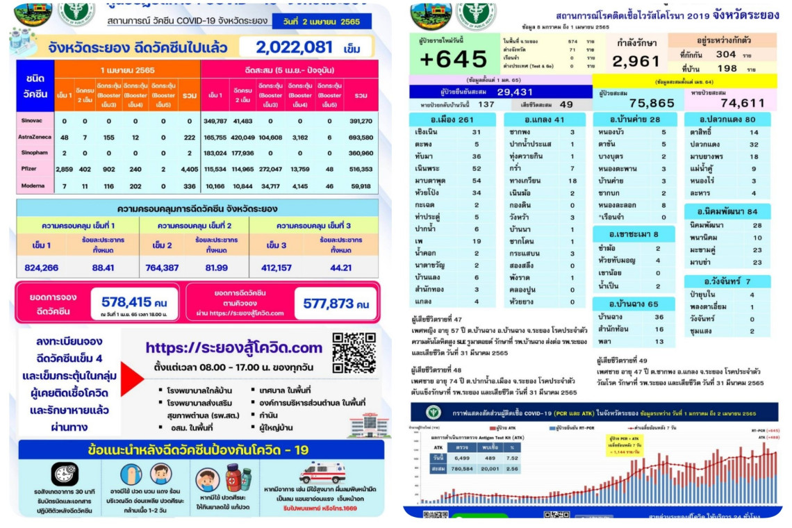 เมื่อวันที่ 2 เม.ย.65 ศูนย์ปฏิบัติการฯ โควิด-19 ระยอง โดยนายชาญนะ เอี่ยมแสง ผวจ.ระยองรายงานสถานการณ์การแพร่ระบาดโควิด-19 ของ จ.ระยองว่า วันนี้พบผู้ติดเชื้อโควิดเสียชีวิต 2 ราย รายแรกเป็นเพศหญิง อายุ 57 ปี ชาว ต.บ้านฉาง อ.บ้านฉาง มีโรคประจำตัว ความดันโลหิตสูง SLE รูมาตอยด์ เข้ารักษาตัว รพ.บ้านฉาง ส่งต่อ รพ.ระยอง และเสียชีวิตวันที่ 31 มี.ค.อีกรายเป็นเพศชาย อายุ 74 ปี ต.ปากน้ำ อ.เมืองระยอง มีโรคประจำตัว ตับแข็ง เข้ารักษาตัวที่ รพ.ระยอง และเสียชีวิตวันที่ 31 มี.ค.ทำให้มียอดผู้ติดเชื้อเสียชีวิตสะสมระลอกใหม่เพิ่มเป็น 49 รายแล้ว ส่วนผู้ติดเชื้อรายวันพบเพิ่ม 645 ราย ผู้ติดเชื้อสะสมละลอกใหม่เพิ่มเป็น 75,865 ราย หายป่วยแล้ว 74,661 ราย