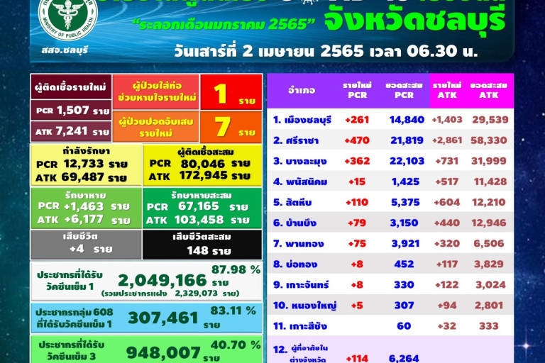 ผู้ป่วยใส่ท่อช่วยหายใจ 1 ราย ผู้ป่วยปอดอับเสบรายใหม่ 7 ราย 3 อำเภอที่ติดเชื้อสูงสุดได้แก่ อ.ศรีราชา 470 ราย อ.บางละมุง 362 ราย อ.เมืองชลบุรี 261 รายรวมติดเชื้อสะสมระลอกใหม่จากผลตรวจ RT-PCR จำนวน 80,046 ราย ไม่นับรวมผลตรวจ ATK อีกจำนวน 172,945 ราย เสียชีวิตสะสม 148 ราย