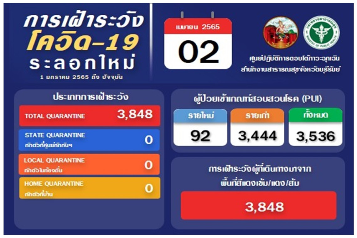 ส่วนผู้ป่วยเข้าเกณฑ์สอบสวนโรค (PUI) ทั้งหมด 3,536 ราย เป็นรายใหม่ 92 ราย และรายเก่า 3,444 ราย การเฝ้าระวังผู้ที่เดินทางมาจากพื้นที่สีแดงเข้ม/แดง/ส้ม 3,848 ราย