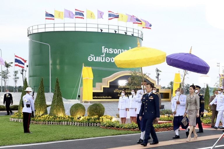 จากนั้น เสด็จออกจากพลับพลาพิธีไปยังแท่นพิธี ทรงกดปุ่มไฟฟ้าเปิดแพรคลุมป้ายโครงการฯ พระสงฆ์เจริญชัยมงคลคาถา ชาวพนักงานลั่นฆ้องชัย ประโคมสังข์ แตร ดุริยางค์ เสร็จแล้ว