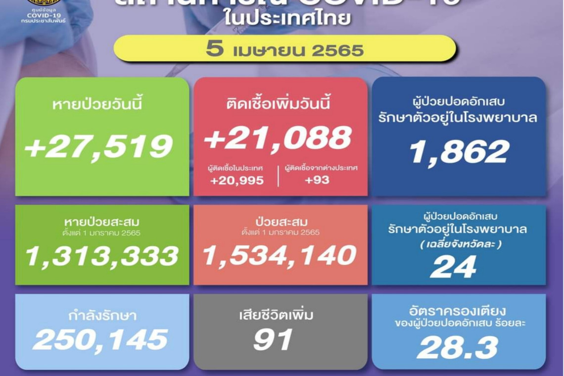 วันที่ 5 เม.ย.2565 ศูนย์ข้อมูล COVID-19 รายงานยอดผู้ติดเชื้อโควิด-19 รายใหม่จำนวน 21,088 ราย จำแนกเป็น ติดเชื้อในประเทศ 20,995 ราย ติดเชื้อจากต่างประเทศ 93 ราย ทำให้ยอดผู้ป่วยสะสมตั้งแต่ 1 มกราคม 2565 มีจำนวน 1,534,140 ราย