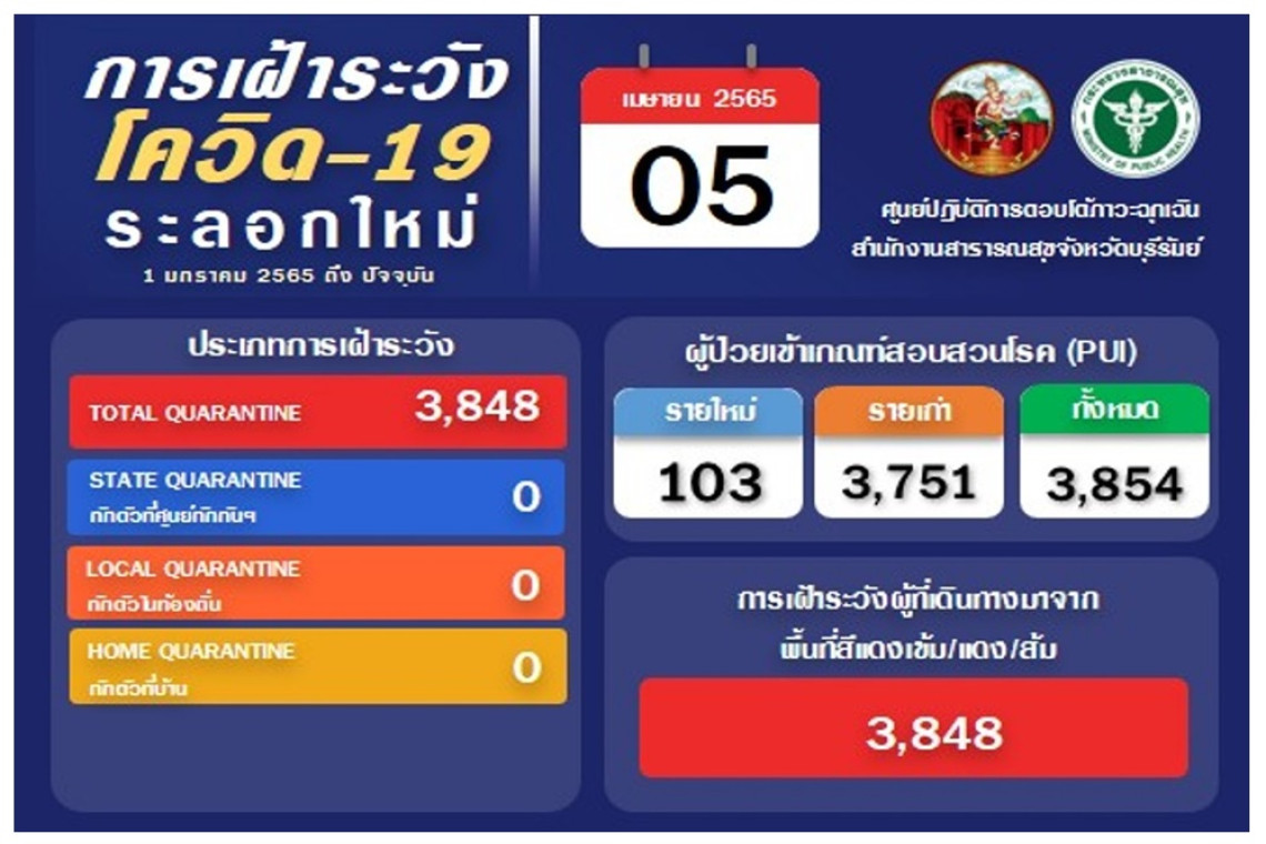 วันนี้ (6 เม.ย.65) สำนักงานสาธารณสุขจังหวัดบุรีรัมย์ ได้รายงานข้อมูลสถานการณ์แพร่ระบาดของโรคติดเชื้อไวรัสโควิด-19 ในพื้นที่ จ.บุรีรัมย์ ระลอกใหม่ ตั้งแต่วันที่ 1 ม.ค.65 ถึงวันที่ 5 เม.ย.65 ว่า วันนี้ เพียงวันเดียว พบผู้ป่วยยืนยันติดเชื้อโควิด-19 รายใหม่ จำนวน 525 ราย มีผู้เสียชีวิต 2 ราย ที่ อ.พุทไธสง 1 ราย เป็นเพศหญิง อายุ 65 ปี และ อ.แคนดง 1 ราย เป็นเพศหญิง 77 ปี โดยพบติดเชื้อในพื้นที่จังหวัด 506 ราย และติดเชื้อจากนอกพื้นที่ 19 ราย ซึ่งติดเชื้อมาจากจังหวัดเสี่ยงทั้งหมด รวมยอดผู้ป่วยสะสมติดเชื้อโควิด-19 ระลอกมกราคม 29,926 ราย มีผู้เสียชีวิตสะสม 43 ราย หายป่วยสะสม 24,085 ราย และยังรักษาอยู่ 5,798 ราย กระจายตามโรงพยาบาลต่างๆ ในพื้นที่จังหวัด