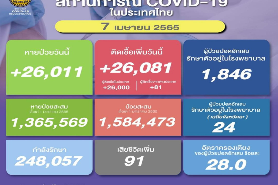 วันที่ 7 เม.ย.2565 ศูนย์ข้อมูล COVID-19 รายงานยอดผู้ติดเชื้อโควิด-19 รายใหม่จำนวน 26,081 ราย จำแนกเป็น ติดเชื้อในประเทศ 26,000 ราย ติดเชื้อจากต่างประเทศ 81 ราย ทำให้ยอดผู้ป่วยสะสมตั้งแต่ 1 มกราคม 2565 มีจำนวน 1,584,473 ราย