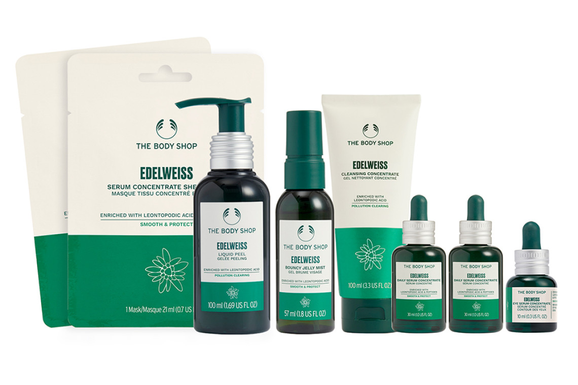 กลุ่มผลิตภัณฑ์ EDELWEISS: ส่วนผสมใหม่ที่ล้ำสมัยยิ่งกว่า ได้รับการรับรองโดยองค์กรเพื่อผลิตภัณฑ์ Vegan พร้อมสารต้านอนุมูลอิสระที่ทรงพลังยิ่งขึ้น อัพเกรดกว่าเดิม เพื่อเพิ่มเติมความเข้มข้นจากสารสกัดของดอกอะเดลไวส์ สเต็มเซลล์และสารสกัดจากดอกอะเดลไวส์อันอุดมไปด้วยสารต้านอนุมูลอิสระ ผสานเข้ากับเปปไทด์จากธรรมชาติ ช่วยบูสต์กระบวนการปกป้องผิวและปราการเก็บกักน้ำหล่อเลี้ยงผิว ในขณะที่เปปไทด์ส่วนใหญ่ในท้องตลาดคือแบบสังเคราะห์ แต่ The Body Shop นั้นมาจากธรรมชาติ โดยสกัดจากเมล็ดข้าวนั่นเองกลุ่มผลิตภัณฑ์ Edelweiss ยังคงนำเสนอ Concentrate Serum ผลิตภัณฑ์ระดับตำนานซึ่งเป็นผลิตภัณฑ์ขายดี ที่ได้รับพัฒนามาจากกลุ่มผลิตภัณฑ์ Drops of Youth พร้อมได้ขยายผลิตภัณฑ์เพิ่ม 2 ชิ้น ได้แก่ Edelweiss Cleansing Concentrate (วางจำหน่ายในเดือนเมษายน) และ Edelweiss Intense Smoothing Cream (วางจำหน่ายในเดือนมิถุนายน) เพื่อตอบทุกความต้องการผิวในทุกวัน