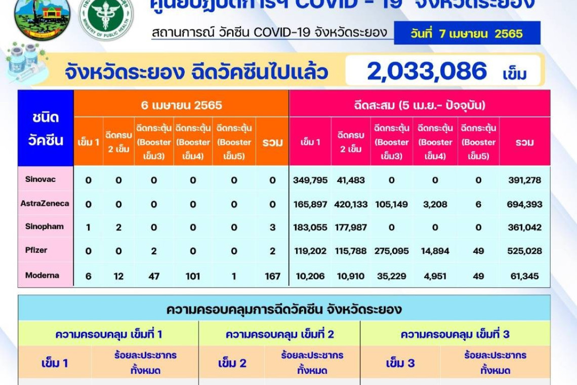เมื่อวันที่ 7 เม.ย.65 ศูนย์ปฏิบัติการฯ โควิด-19 ระยอง โดยนายชาญนะ เอี่ยมแสง ผวจ.ระยอง รายงานสถานการณ์การแพร่ระบาดโควิด-19 ของ จ.ระยองว่า วันนี้พบผู้ติดเชื้อโควิดเสียชีวิต 2 ราย รายแรกเป็นเพศชาย อายุ 86 ปี ชาว จ.กำแพงเพชร มีโรคประจำตัว ความดันโลหิตสูง ไตวาย เบาหวาน เข้ารักษาตัว รพ.เฉลิมพระเกียรติระยอง และเสียชีวิตวันที่ 2 เม.ย.และอีกราย เป็นเพศชาย อายุ 84 ปี ชาว จ.สระบุรี มีโรคประจำตัว ความดันโลหิตสูง ไตวาย เบาหวาน เข้ารักษาตัวที่ รพ.กรุงเทพระยอง และเสียชีวิตวันที่ 5 เม.ย.ส่งผลให้มียอดผู้ติดเชื้อเสียชีวิตสะสมระลอกใหม่เพิ่มเป็น 63 รายแล้ว ส่วนผู้ติดเชื้อรายวันพบเพิ่ม 555 ราย ผู้ติดเชื้อสะสมละลอกใหม่เพิ่มเป็น 78,844 ราย หายป่วยแล้ว 77,588 ราย โดยพบผู้ติดเชื้อทั้ง 8 อำเภอ โดยพบสูงสุดอยู่ใน อ.เมืองระยอง 273 ราย รองลงมามี อ.นิคมพัฒนา 62 ราย อ.บ้านฉาง 60 ราย อ.ปลวกแดง 42 ราย อ.แกลง 29 ราย อ.บ้านค่าย 25 ราย อ.วังจันทร์ 9 ราย อ.เขาชะเมา 6 ราย ต่างจังหวัดเข้ามารักษาตัว 49 ราย ยอดฉีดวัคซีนไปแล้ว 2,033,086 เข็ม.