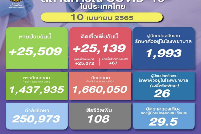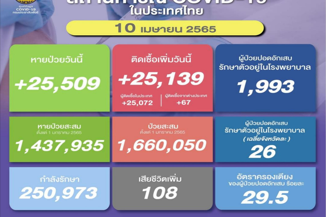 วันที่ 10 เม.ย.2565 ศูนย์ข้อมูล COVID-19 รายงานยอดผู้ติดเชื้อโควิด-19 รายใหม่จำนวนถ 25,139 ราย จำแนกเป็น ติดเชื้อในประเทศ 25,072 ราย ติดเชื้อจากต่างประเทศ 67 ราย ทำให้ยอดผู้ป่วยสะสมตั้งแต่ 1 มกราคม 2565 มีจำนวน 1,660,050 ราย