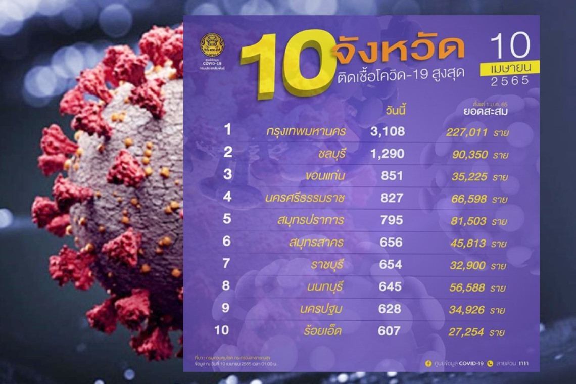 วันที่ 10 เม.ย.65 ศูนย์บริหารสถานการณ์โควิด-19 (ศบค.) รายงานจังหวัดติดเชื้อโควิดสูงสุด 10 จังหวัด พบว่า กรุงเทพมหานคร มียอดติดเชื้อโควิดสูงสุดอันดับ 1 ของประเทศ โดยมีจำนวน 3,108 ราย ขณะที่ ชลบุรี ขอนแก่น นครศรีธรรมราช สมุทรปราการ สมุทรสาคร ราชบุรี นนทบุรี นครปฐม และร้อยเอ็ด มีจำนวนผู้ติดเชื้อสูงสุดรองลงมาตามลำดับ