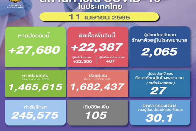 วันที่ 11 เม.ย.2565 ศูนย์ข้อมูล COVID-19 รายงานยอดผู้ติดเชื้อโควิด-19 รายใหม่จำนวนถ 22,387 ราย จำแนกเป็น ติดเชื้อในประเทศ 22,300 ราย ติดเชื้อจากต่างประเทศ 87 ราย ทำให้ยอดผู้ป่วยสะสมตั้งแต่ 1 มกราคม 2565 มีจำนวน 1,682,437 ราย