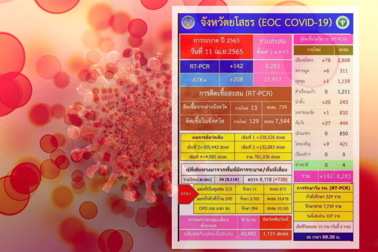 วันที่ 11 เมษายน 2565 จังหวัดยโสธรพบผู้ป่วยที่ติดเชื้อไวรัสโควิด-19 เพิ่มต่อเนื่องพบเพิ่มอีก 142 ราย ป่วยสะสม 8,283 รายและเสียชีวิตสะสม 15 ราย โดยอำเภอเมืองยโสธร 2,808 ราย อำเภอทรายมูล 311 ราย อำเภอกุดชุม 1,159 ราย อำเภอคำเขื่อนแก้ว 1,211 ราย อำเภอมหาชนะชัย 832 ราย อำเภอค้อวัง 444 ราย อำเภอเลิงนกทา 850 ราย อำเภอไทยเจริญ 421 ราย อำเภอป่าติ้ว 243 รายส่วนผู้ป่วยโควิด-19 ของจังหวัดยโสธรตั้งแต่วันที่ 1 มกราคม 2565 ป่วยสะสมจำนวน 8,283 ราย รักษาหาย 7,739 ราย กำลังรักษา 529 ราย