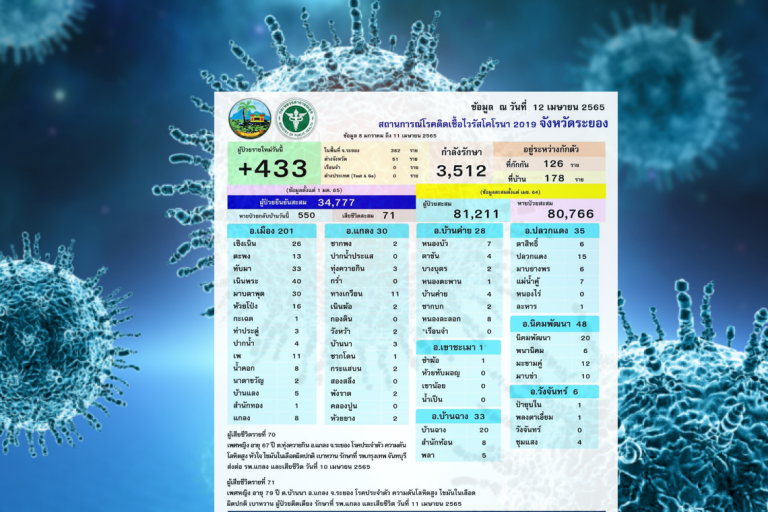 เมื่อวันที่ 12 เม.ย.65 ศูนย์ปฏิบัติการฯ โควิด-19 ระยอง โดยนายชาญนะ เอี่ยมแสง ผวจ.ระยอง รายงานสถานการณ์การแพร่ระบาดโควิด-19 ของ จ.ระยองว่า วันนี้พบผู้ติดเชื้อโควิดเสียชีวิต 2 ราย รายแรกเป็นเพศหญิง อายุ 67 ปี ชาว ต.ทุ่งควายกิน อ.แกลง มีโรคประจำตัว ความดันโลหิตสูง หัวใจ เบาหวาน ไขมันในเลือดผิดปกติ เข้ารักษาตัว รพ.กรุงเทพจันทบุรี ส่งต่อ รพ.แกลง และเสียชีวิตวันที่ 10 เม.ย.อีกรายเป็นเพศหญิง อายุ 79 ปี ชาว ต.บ้านนา อ.แกลง มีโรคประจำตัว ความดันโลหิตสูง เบาหวาน ไขมันในเลือดผิดปกติ ผู้ป่วยติดเตียง เข้ารักษาตัวที่ รพ.แกลง และเสียชีวิตวันที่ 11 เม.ย.มียอดผู้ติดเชื้อเสียชีวิตสะสมระลอกใหม่เพิ่มเป็น 71 ราย ส่วนผู้ติดเชื้อรายวันพบเพิ่ม 433 ราย ผู้ติดเชื้อสะสมละลอกใหม่เพิ่มเป็น 81,211 ราย หายป่วยแล้ว 80,766 ราย โดยพบผู้ติดเชื้อ 8 อำเภอ โดยพบสูงสุดอยู่ใน อ.เมืองระยอง 201 ราย รองลงมามี อ.นิคมพัฒนา 48 ราย อ.ปลวกแดง 35 ราย อ.บ้านฉาง 33 ราย อ.แกลง 30 ราย อ.บ้านค่าย 28 ราย อ.วังจันทร์ 6 ราย อ.เขาชะเมา 1 ราย ต่างจังหวัดเข้ามารักษาตัว 51 ราย.