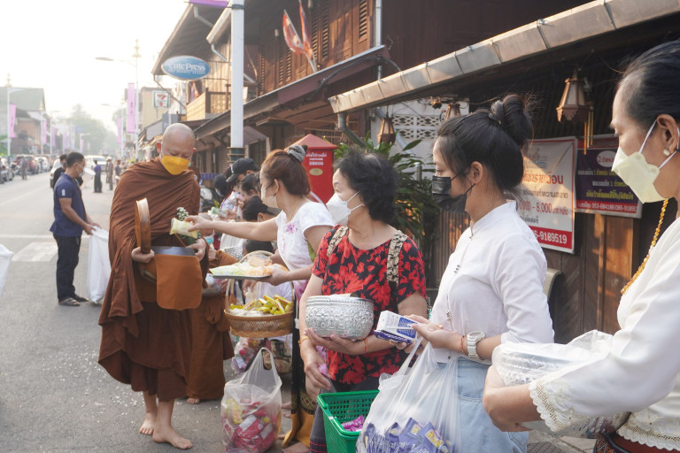 เจ้าอาวาสวัดภูสมณาราม ต.ปางหมู อ.เมือง จ.แม่ฮ่องสอน นำสามเณรน้อย และพระสงฆ์ กว่า 64 รูป สวมหน้ากากอนามัย ออกรับบิณฑบาต สร้างขวัญกำลังใจให้ญาติโยมในเขตเทศบาลเมืองแม่ฮ่องสอนในห้วงเทศกาลสงกรานต์นี้