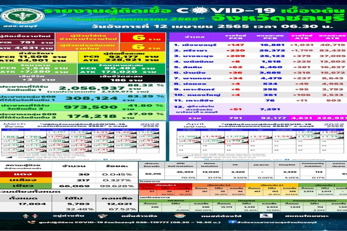 วันที่ 12 เม.ย.65 สสจ.ชลบุรี มีรายงานพบผู้ติดเชื้อโควิด-19 รายใหม่ จำนวน 791 ราย (ผู้ติดเชื้อยืนยัน RT-PCR) จากคนที่พักอาศัยในจังหวัดระยอง เข้ามารักษาในจังหวัดชลบุรี 40 ราย และจังหวัดอื่นๆ 35 ราย จากอาชีพเสี่ยงพบปะผู้คนจำนวนมาก 30 รายบุคลากรทางการแพทย์ 22 ราย ให้ประวัติเดินทางมาจากต่างจังหวัด 1 ราย สัมผัสผู้ป่วยยืนยัน ในครอบครัวจากสถานที่ทำงาน บุคคลใกล้ชิดร่วมวงสังสรรค์ รวม 280 ราย สัมผัสผู้ป่วยยืนยัน (อยู่ระหว่างสอบสวนโรค) 17 ราย และอยู่ระหว่างการสอบสวนโรค 401 ราย